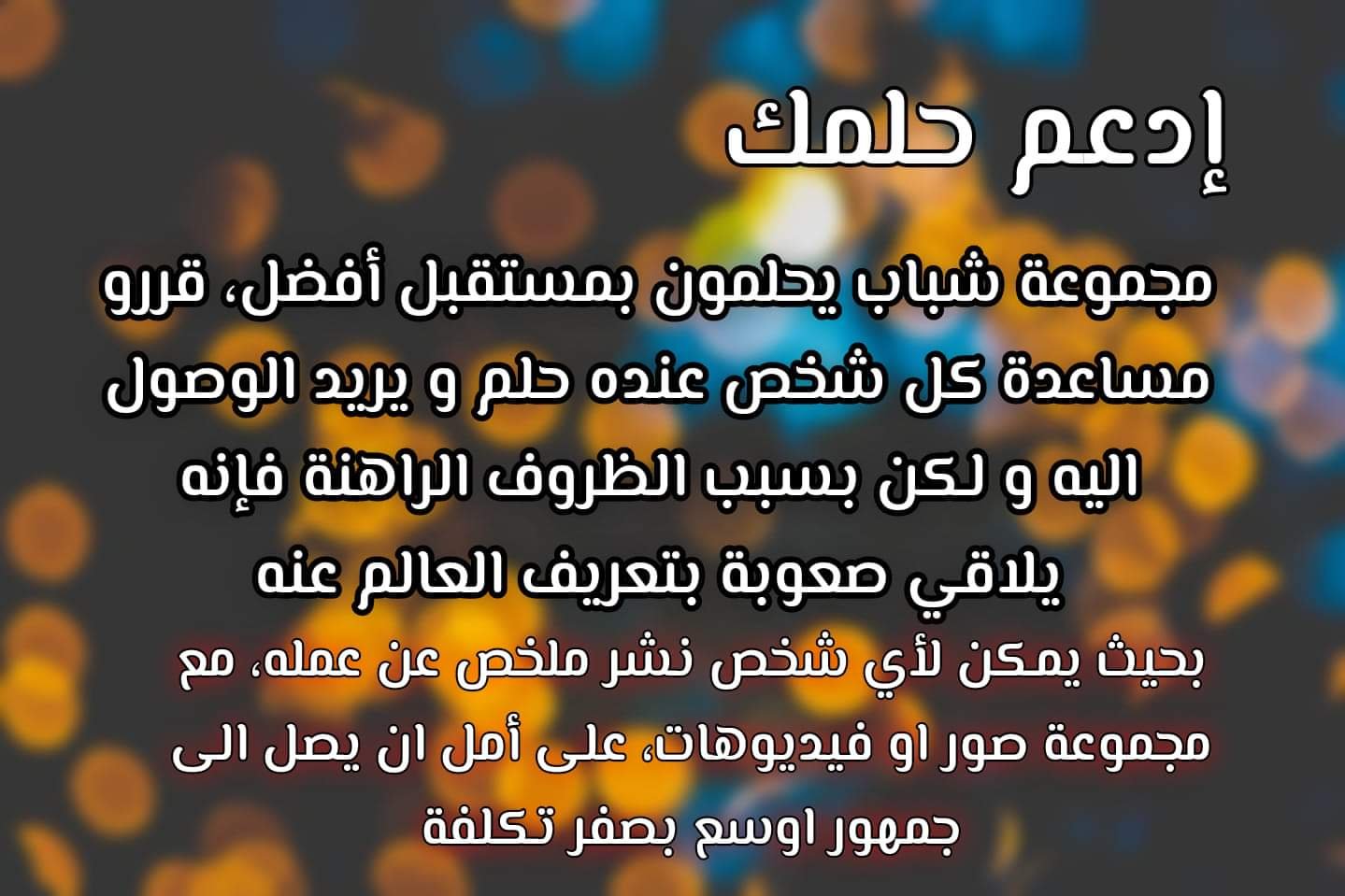 #ادعم_حلمك مبادرة شبابية مجانية يمكن لجميع الأشخاص على تنوع اعمالهم ان ينشرو ملخص عن عملهم الذين يحلمون في تطويره من خلال زيادة اعداد الزبائن او الجمهور سواء كانو صناع محتوى على منصات التواصل الاجتماعي او اصحاب اعمال أو مهن صغيرة او فنيين(موسيقيين،عازفين،مصورين او